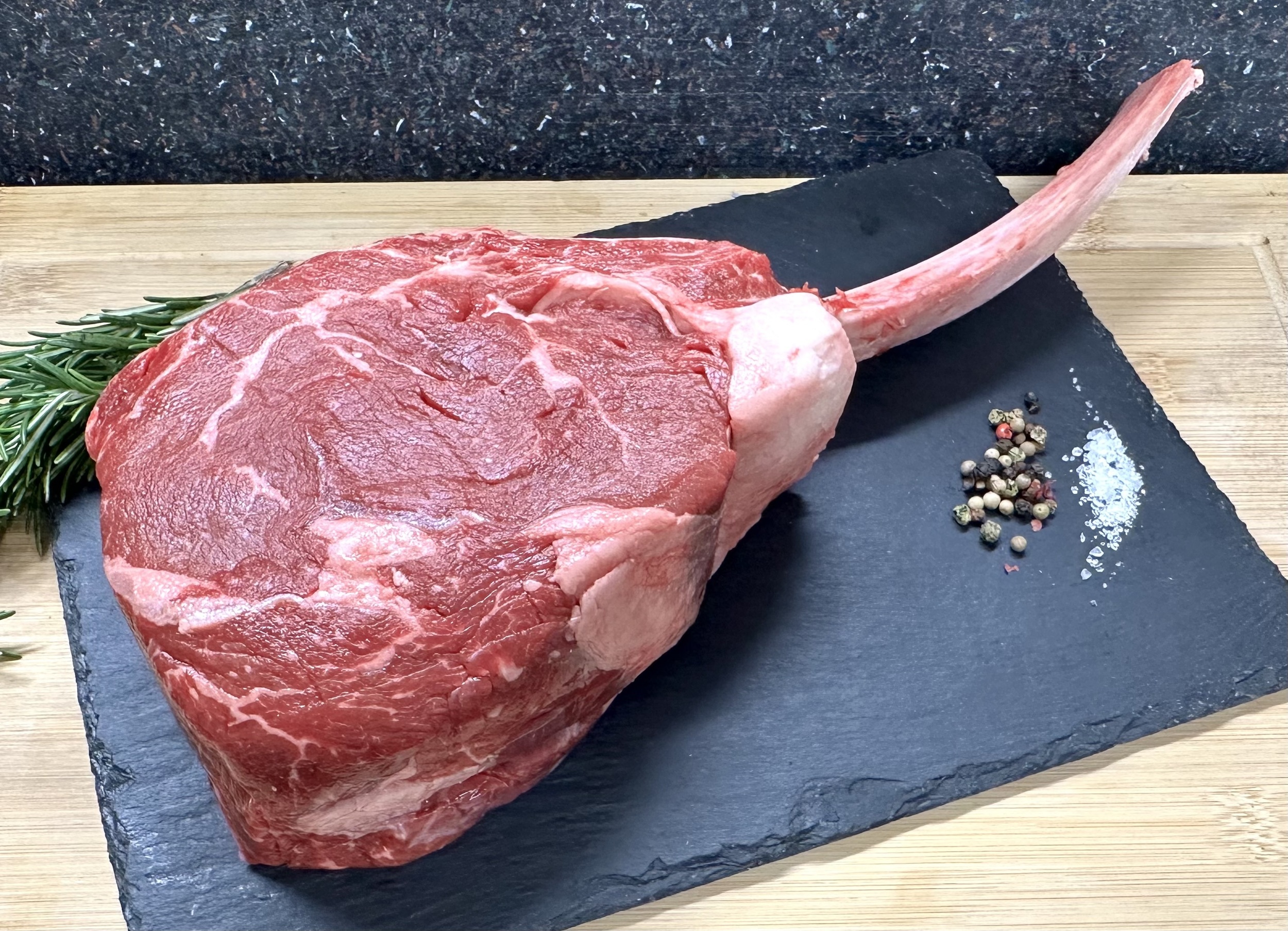 The Tomahawk is a bone-in Rib-eye cut from the fore-rib - leaving the whole rib bone on the steak, hence the name - tomahawk! Prime Tomahawk Steak, A meat lover's dream! This hefty piece of meat is a carnivore’s dream. Thick, chunky steak with impressive marbling, full of quality and flavour. Share with the ones you love, or simply savour the flavour and keep it all for yourself… We won’t judge.